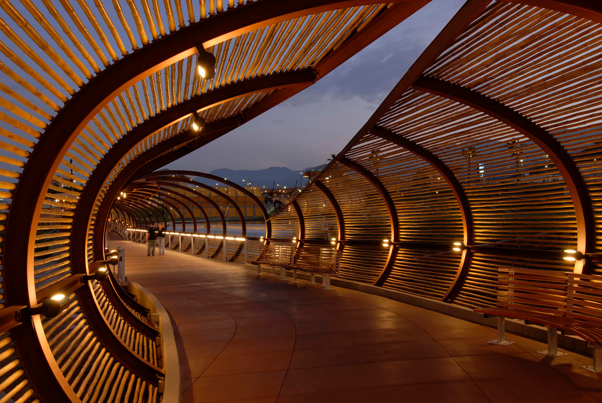 The project consists of a unique free-form walkway structure and 120-ft pedestrian bridge over a central theme lake. The walkway end bridge are covered by steel ribs spaced at 10-ft on center that open and close forming following pattern. The walkway links residential and retail areas of the development. A 120-ft long water wall that acts as a dam between the two artificial lakes was also engineered as part of this project.